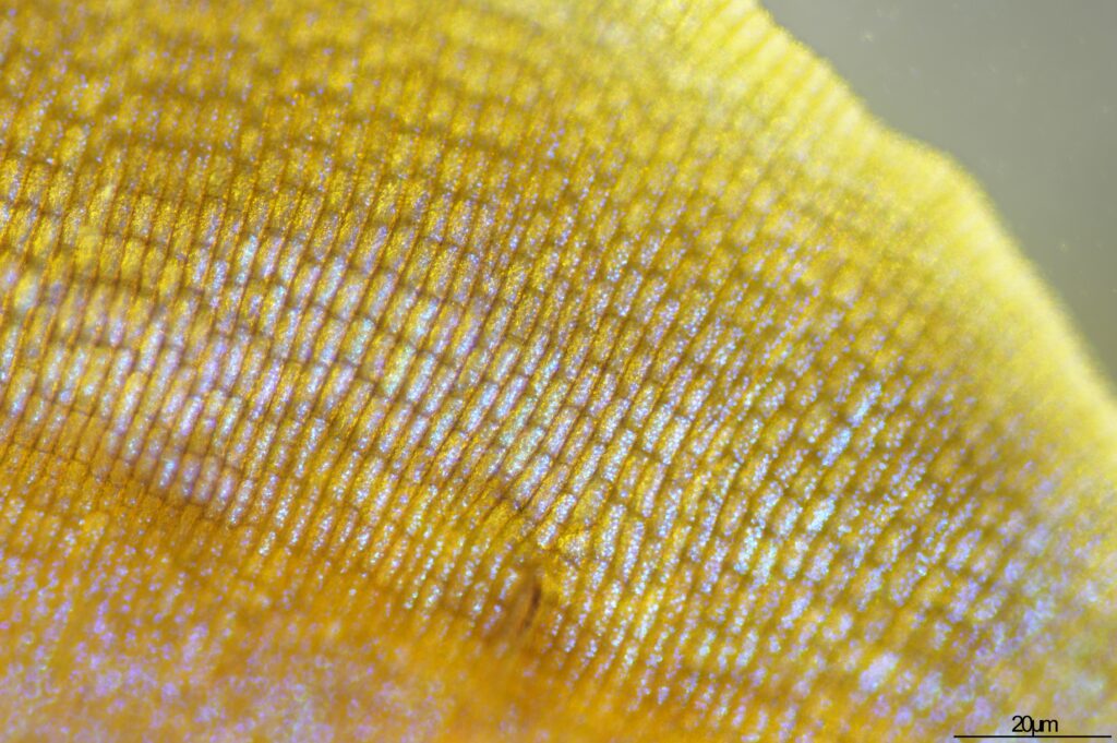 細胞は細長く、その中に多数の発色体がある。細胞は2層で上側に多くの発色構造がある。イリデッセント・ボディではない可能性が高いが不明。