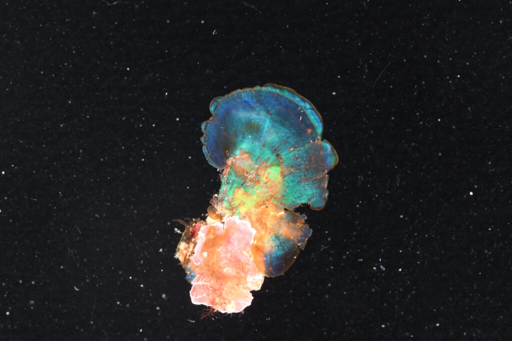 構造色は緑~青色。ときに複数色が混じる。表側が発色する。明るい場所では緑色の傾向がある。複数種の存在が示唆されている。